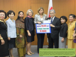 YWCA of Bangkok and Diplomatic Spouses have presented the donation of 200,000 Baht to assist the earthquake/Tsunami victims in Japan through Japanese Ambassador H.E. Mr. Seiji Kojima and his wife Mrs. Tammy Kojima on 30 March 2011 at the Embassy of Japan in Thailand